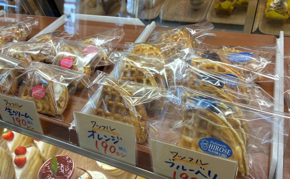 Cakes, cookies, waffles, and many other products are available at the cute shop.